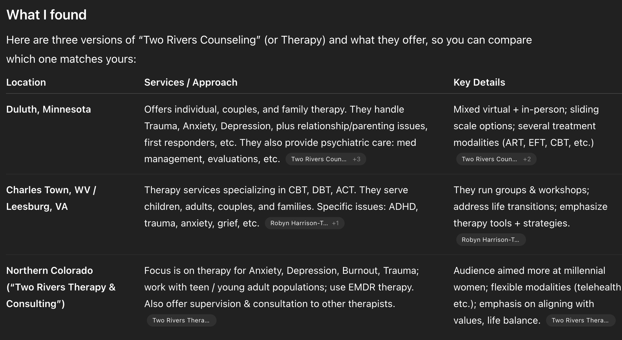 In a quick check, AI search tools do recognize Two Rivers Counseling as a local therapy provider. For example, ChatGPT identifies the practice as offering therapy for children, adults, couples, and families with offices in West Virginia and Virginia. That’s a strong foundation.